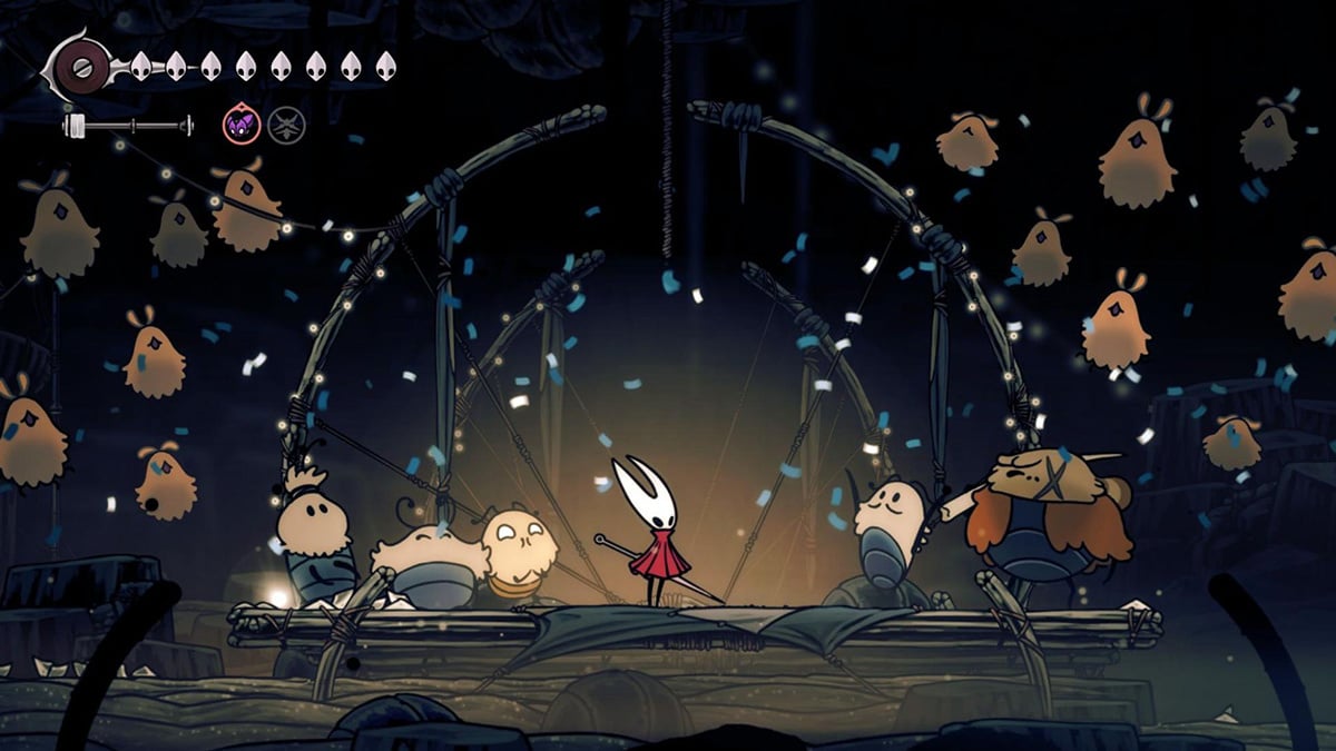 Hornet’s moveset reshapes how exploration and combat unfold. She can vault diagonally with a dive attack, chain parries into ripostes, float mid-air with her cloak, and later grapple across arenas with needle hooks. These tools make her faster and more vertical than the Knight, but the added mobility is balanced by higher difficulty. Even common enemies deal two masks of damage, healing restores three masks at once but can be interrupted, and bosses have expanded health pools. With over forty major encounters spread across the game, Silksong consistently demands precision.