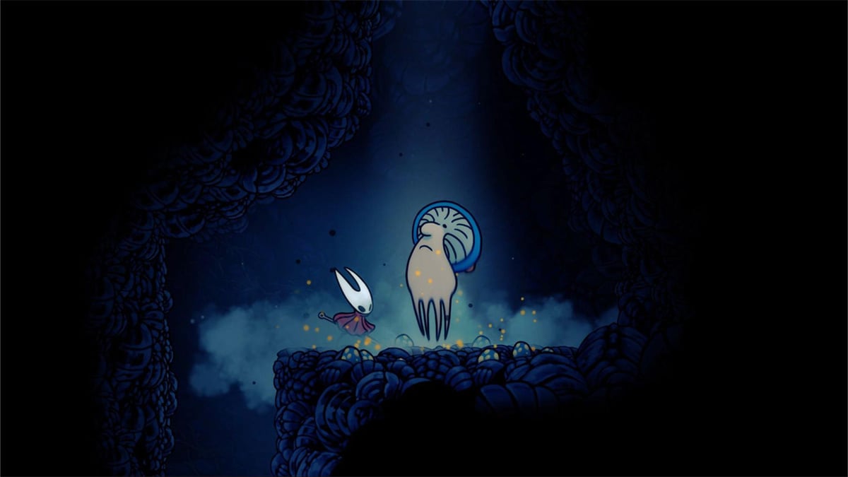 Beyond this, the platforming grows more demanding, with frequent use of double jumps, pogo attacks, and grappling to advance through tight corridors and vertical shafts. Eventually, you’ll reach an unmapped zone where Mister Mushroom waits on a lonely ledge. Speak to him, and he will zoom away.