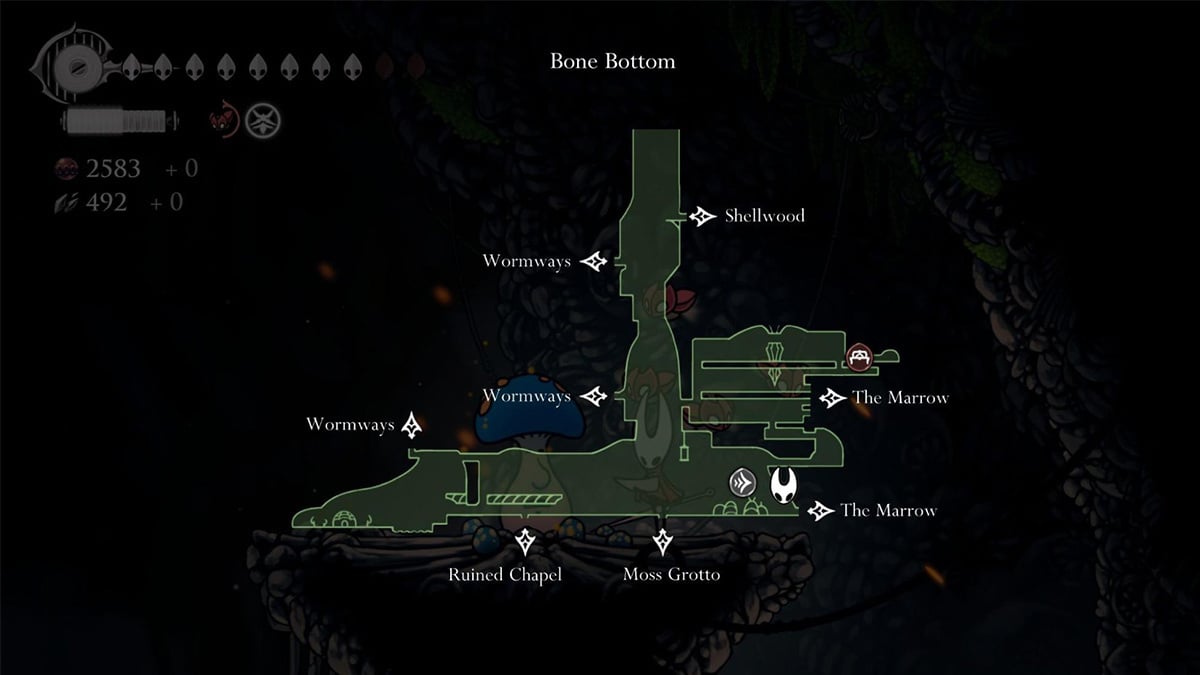 At Bone Bottom, head toward the pathway to The Marrow. You’ll need the Faydown Cloak for double jumps. First, reach the platform to the right of the entrance, then leap left to the next platform where Mister Mushroom is hiding. Use Needolin to pull him out.