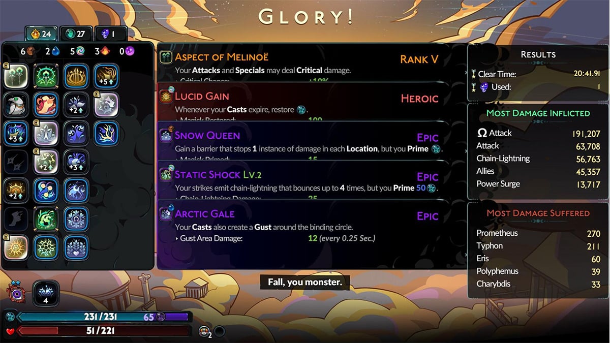 Example: Sea Storm (Zeus + Poseidon) triggers lightning strikes whenever your knockback effects hit enemies.